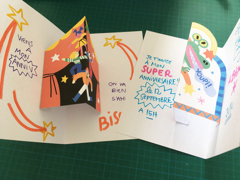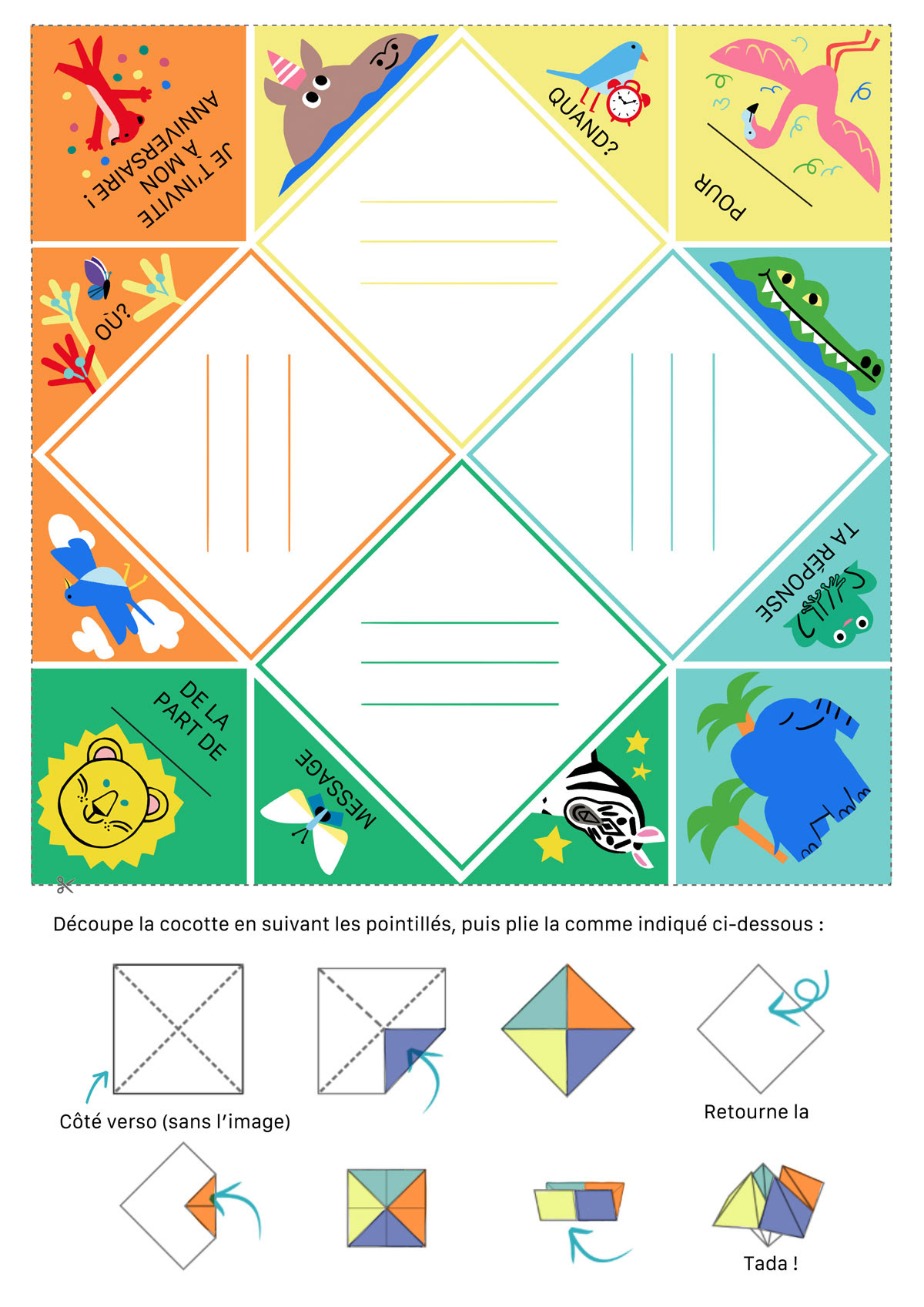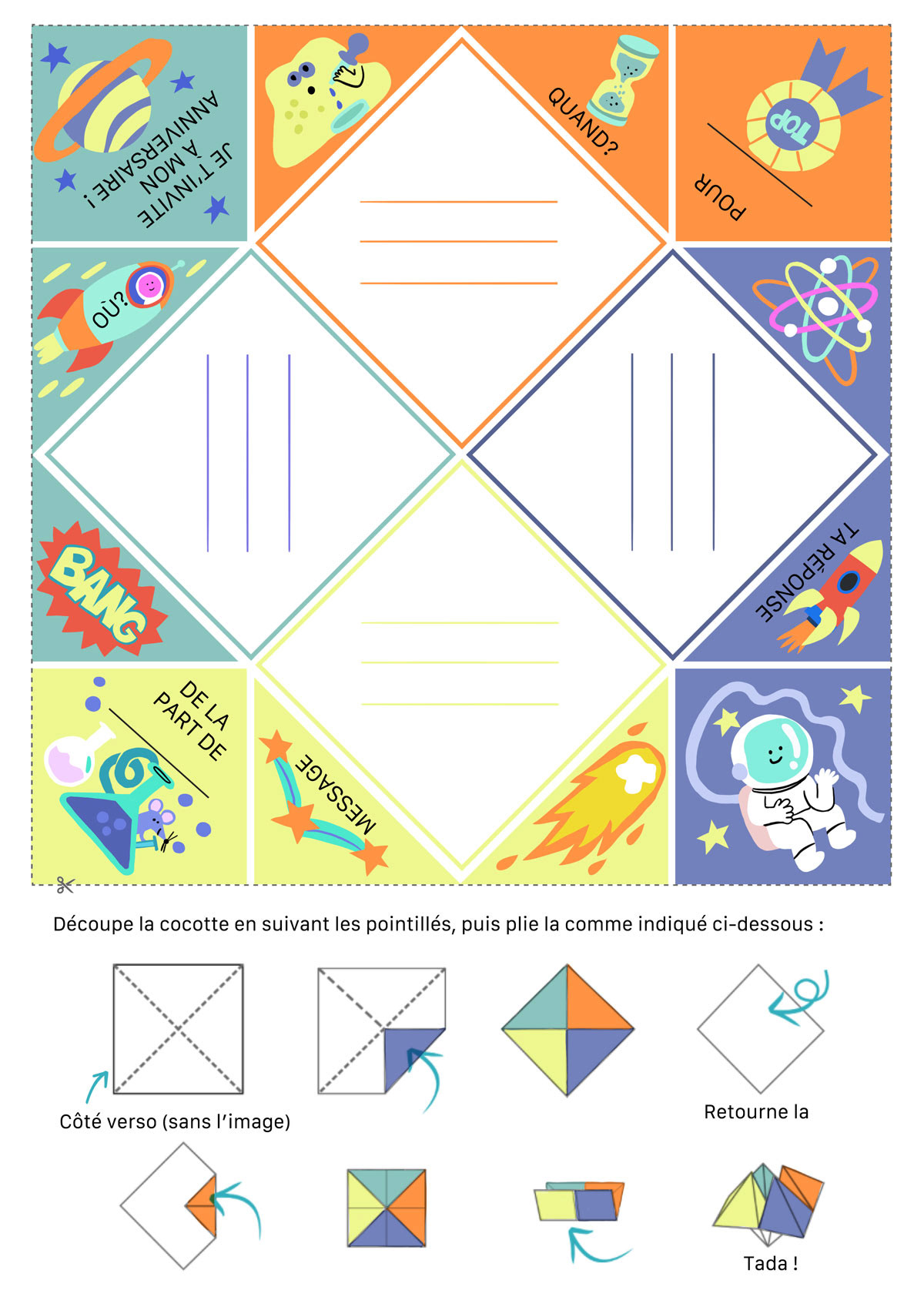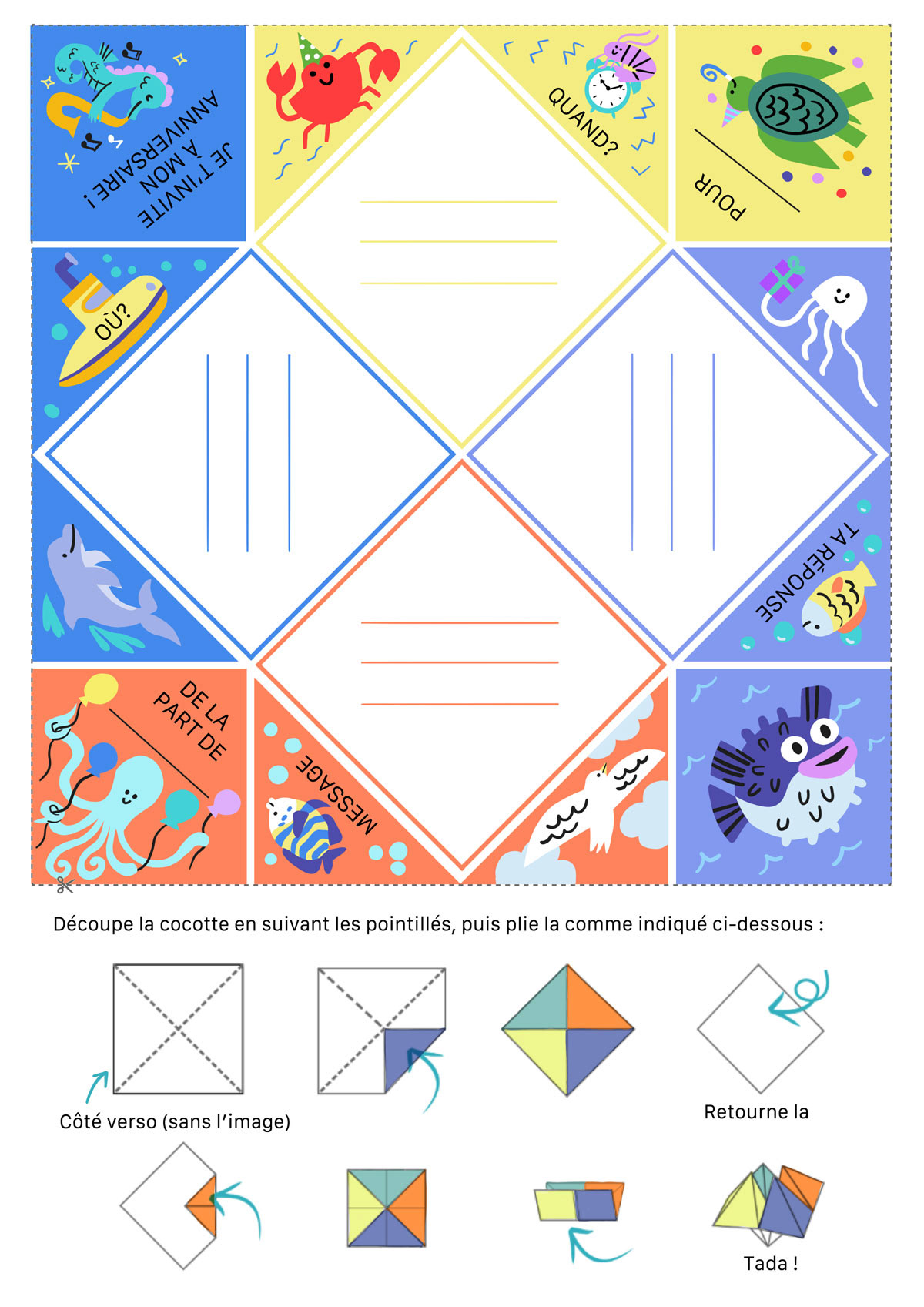 Birthday kit with cool activities such as printable pop cards, paper fortune teller invitations and coloring scenery.
